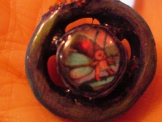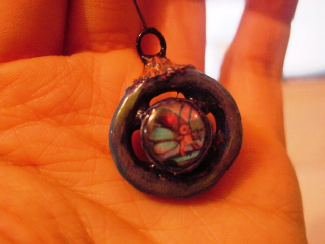 紙粘土みたいな質感の小物に、絵の具で絵を描き、さらにニスを塗ってあり